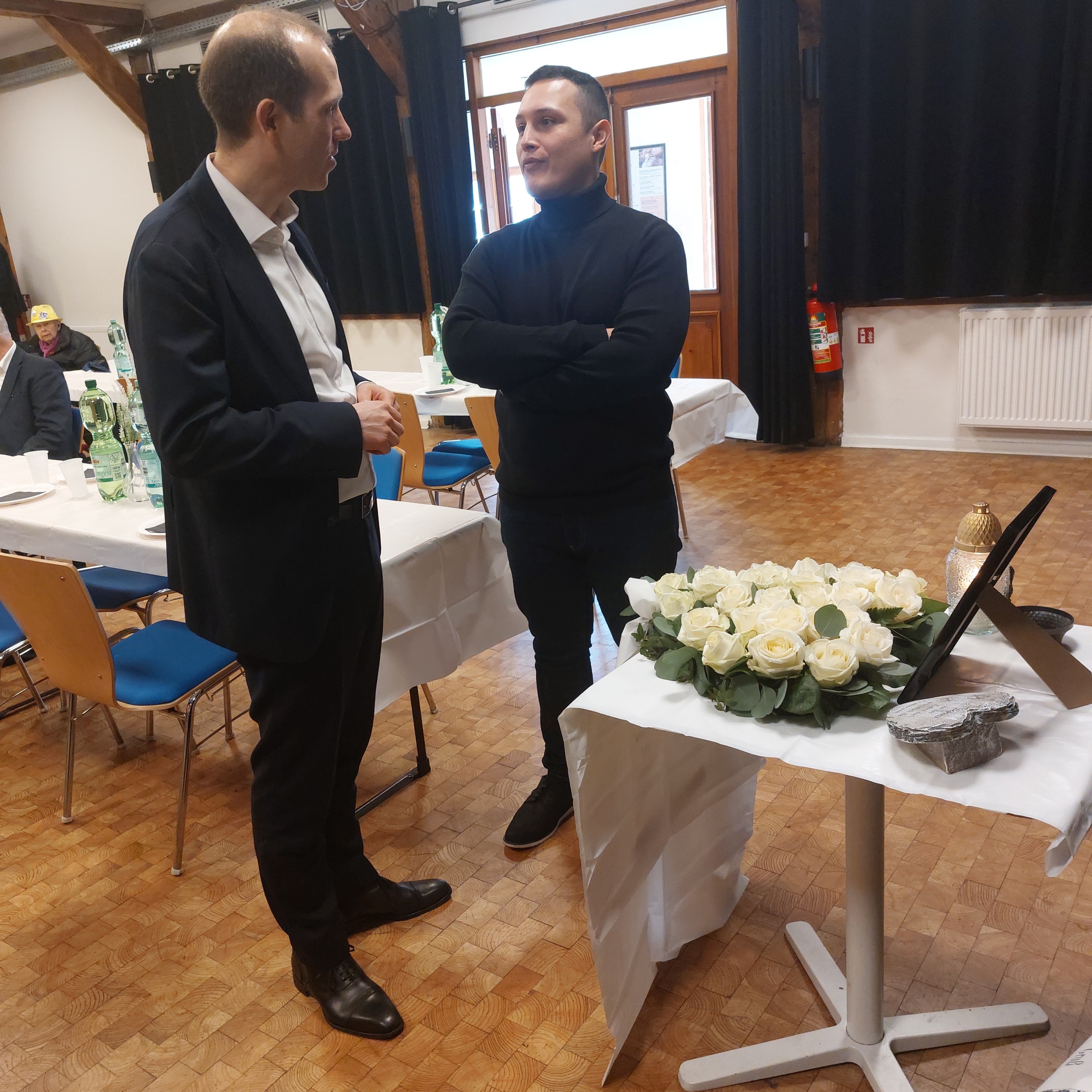 Der Landes- und Kreisvorsitzende Dennis Thering im Austausch mit dem Organisator. Rafael Guzman Hinojosa