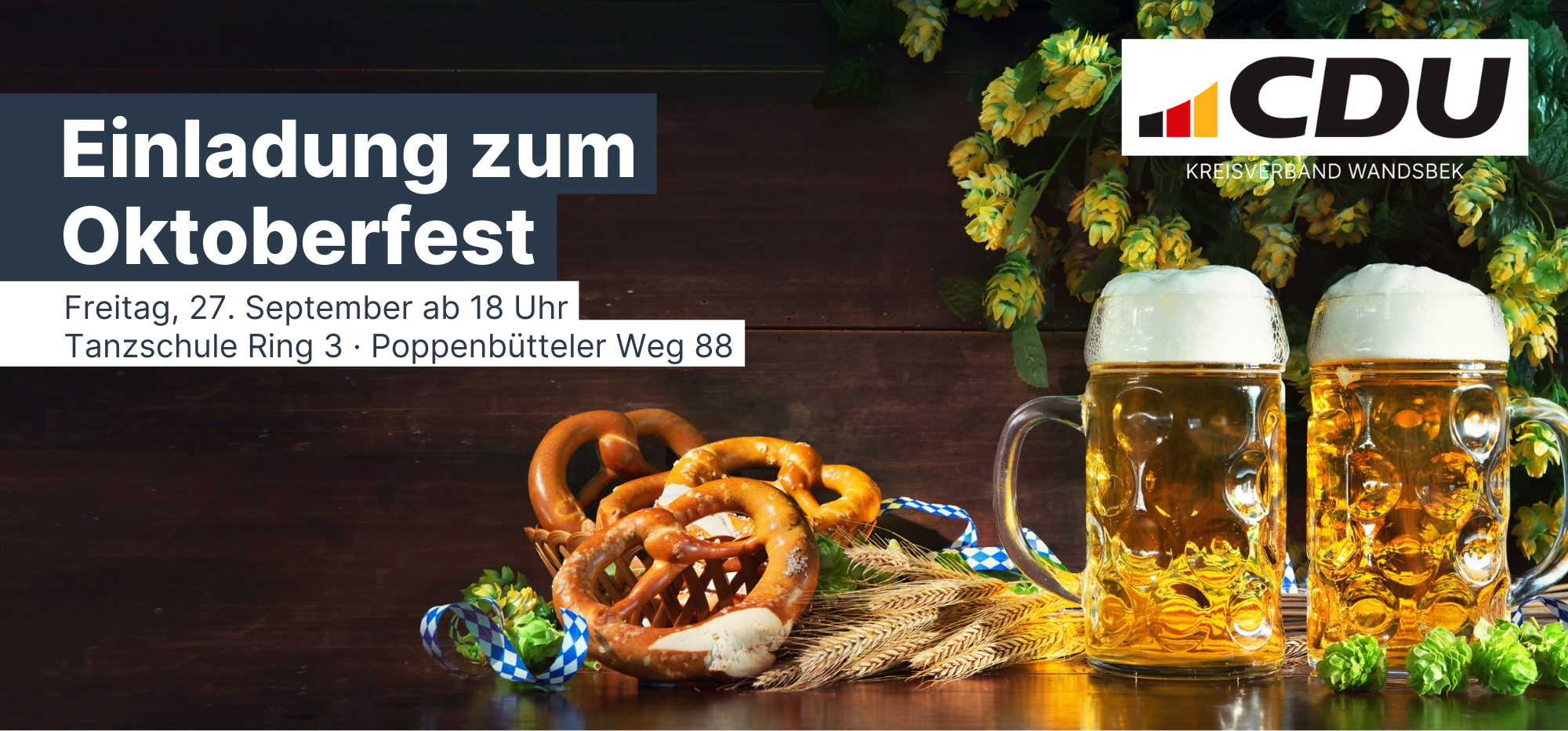 Der CDU-Kreisverband Wandsbek lädt Sie herzlich zu seinem traditionellen Oktoberfest am Freitag, den 27.09.2024 ein. Melden Sie sich gerne mit Ihren Freunden und Verwandten an. Es erwartet Sie ein stimmungsvoller Abend und ein hochkarätiges Rahmenprogramm. Außerdem freuen wir uns, dass der Vorsitzende der CSU-Landesgruppe im Deutschen Bundestag, Alexander Dobrindt, den Abend politisch abrunden wird.