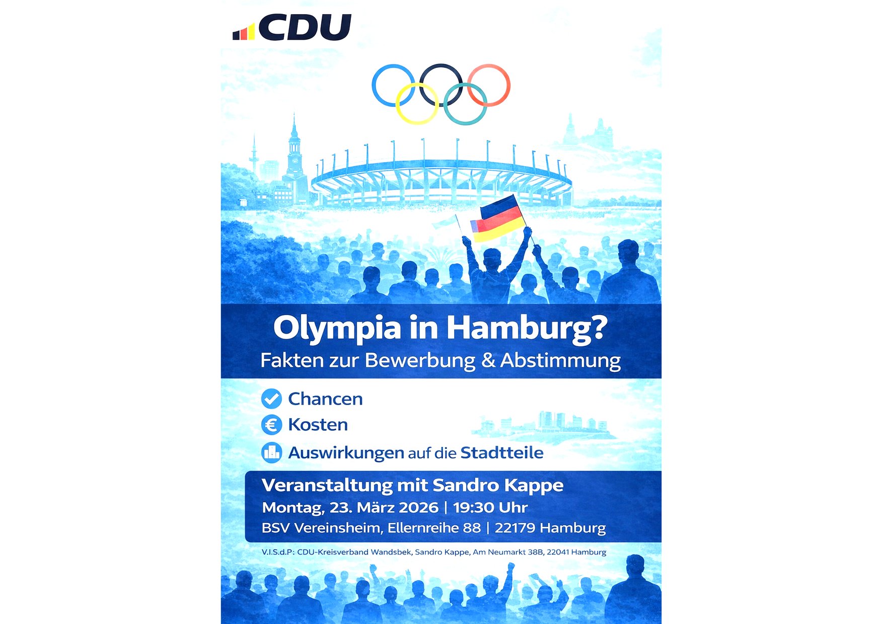 Viele Hamburgerinnen und Hamburger wissen bislang noch gar nicht, dass in absehbarer Zeit eine wichtige Entscheidung ansteht: Es wird eine Abstimmung darüber geben, ob sich Hamburg um die Olympischen Spiele bewerben soll. Worum geht es dabei genau? Warum gibt es diese Abstimmung? Und was würde eine Bewerbung konkret für unsere Stadt – und auch für unsere Stadtteile wie Bramfeld und Steilshoop – bedeuten? Genau hier setzt der CDU-Ortsverband Bramfeld/Steilshoop an. Mit einer Informationsveranstaltung möchten wir frühzeitig Orientierung geben und die wichtigsten Fragen verständlich einordnen.